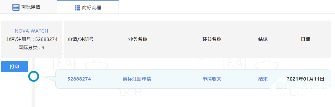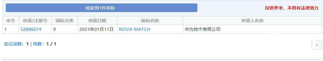 根据商标流程显示,“NOVA WATCH”申请/注册号为52888274,国际分类为9,申请日期为2021年1月11号,申请人为华为技术有限公司。值得注意的是,目前此商标正等待受理,暂无法查询详细信息。