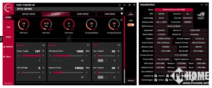 GPU Tweak III 在主窗口提供了快速的配置文件选择,其内置了三个预设模式,分别是默认模式、OC 超频模式、静音模式。还可以根据不同的应用程序自动执行不同的配置文件,并且可显示全面的指标和统计信息。