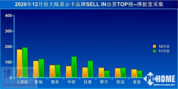 部分品牌商年底提前截单,同时货源依然严重缺货状态,甚至有品牌预留部分货源,为今年第一季度做准备。具体到厂商方面,七彩虹微增当月出货约20万块,高居第一,原本位于第二、第三的华硕、技嘉则出现了断崖式的暴跌,滑落到第四、第五。