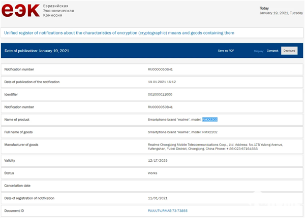 据报道,realme Race(型号为RMX2202)获得EEC认证,这意味着realme Race距离正式发布不远了。