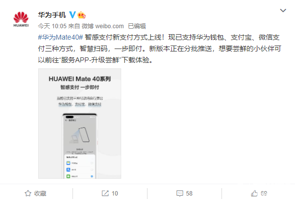 今天上午,华为手机官方微博发布消息,宣布华为Mate 40系列智感支付微信支付方式正式上线,这个新版本系统正在分批推送,目前新的支付方式已经支持华为钱包、支付宝、微信三种。