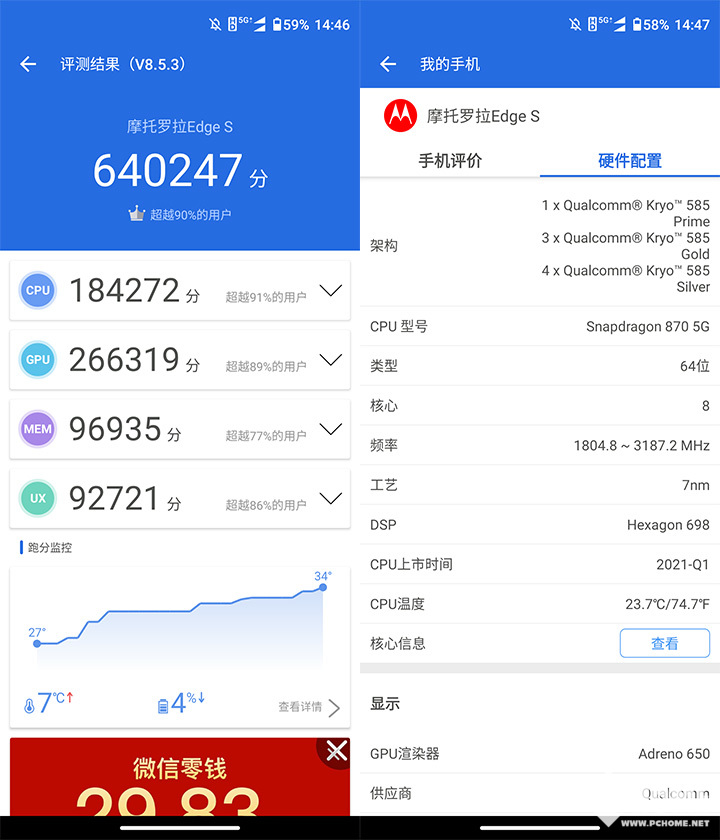 通过实测安兔兔跑分,motorola edge s在常温下的成绩约为65万。考虑到这款手机的定位,还有首发的特性,这个性能还是不错的水平了。