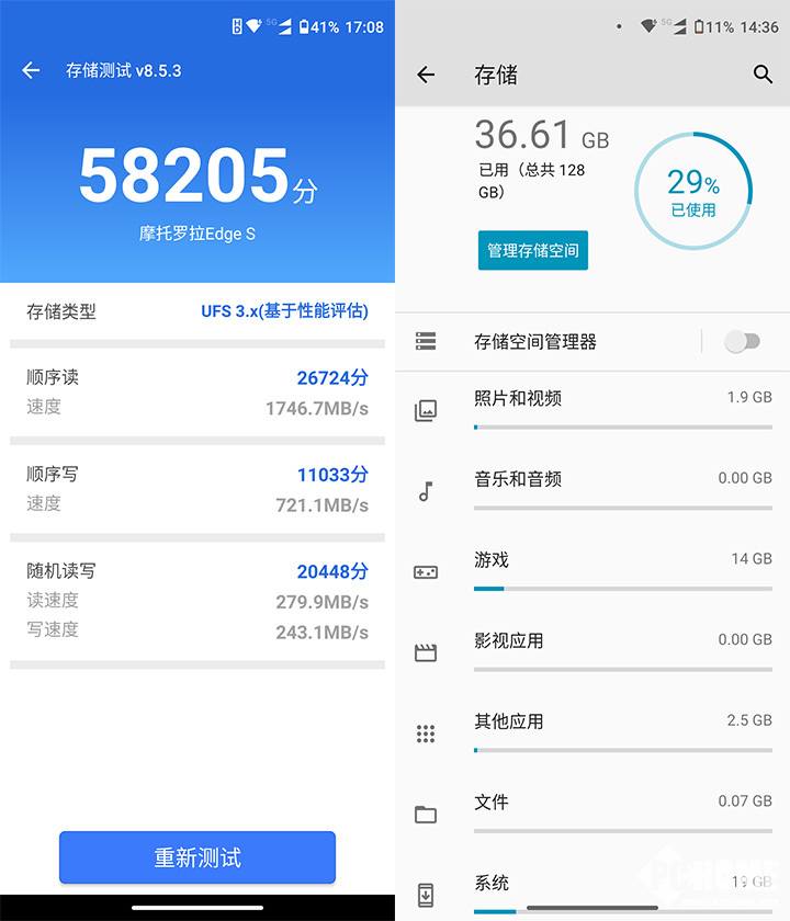 以笔者评测的这台8+128GB版为例,使用安兔兔存储测试motorola edge s的顺序读写高达1746MB/s,顺序写入超过700MB/s,随机读写也非常强悍,都超过了200MB/s。整体性能表现与搭载骁龙888的小米11旗鼓相当。这样强悍的性能表现匹配上骁龙870和原生定制系统,相信会给用户带来非常流畅的日常体验。
