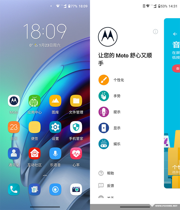 虽然My UI看似比较简单不接地气,但是用起来还是有国产UI那种重体验的影子。总体给人的感觉,就是在安卓原生系统上融入了更多本土化元素。比如桌面上依旧预留了“Moto”这个个性化APP,在里面你可以调整绝大部分个性化功能,包括手势、提示、显示、娱乐几个部分。