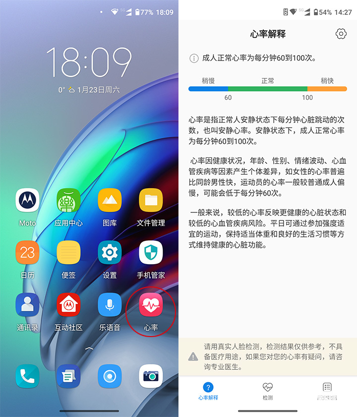 有意思的是,motorola edge s的前置还支持心率检测功能,据悉该技术基于联想研究院尖端研究,通过光谱捕捉,0辐射探测识别生物体征,15秒即可准确反馈心率。用户可实时自查健康状况,方便快捷又高效。