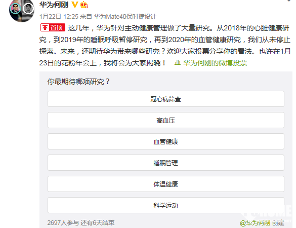 何刚表示“这几年,华为针对主动健康管理做了大量研究。从2018年的心脏健康研究,到2019年的睡眠呼吸暂停研究,再到2020年的血管健康研究,我们从未停止探索。未来,还期待华为带来哪些研究?欢迎大家投票分享你的看法。也许在1月23日的花粉年会上,我将会为大家揭晓。”