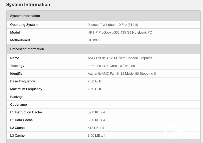 如上图所示,惠普新款的 HP ProBook x360 435 G8 笔记本搭载了这款 R3 5400U,4 核 8 线程,主频 2.6GHz,睿频不详,8MB 三级缓存,Vega 6 核显。作为对比,AMD 上代的 R3 4300U 为 4 核 4 线程,2.7-3.7GHz,4MB 三级缓存,Vega 5 核显。