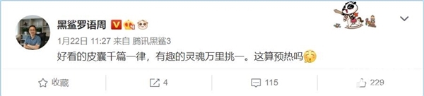 黑鲨科技CEO罗语周在微博表示,好看的皮囊千篇一律,有趣的灵魂万里挑一。疑似暗示黑鲨4的工业设计“万里挑一”,预计会以全新面貌呈现给玩家,值得期待。