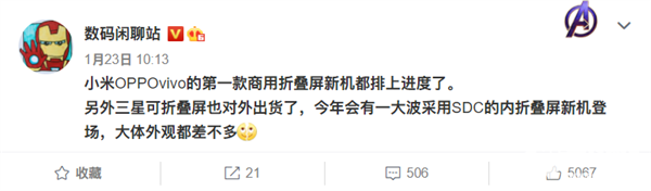 据之前报道,今年将会有多家手机厂商发布折叠屏手机。据@数码闲聊站爆料,小米、OPPO、vivo的第一款商用折叠屏新机都排上进度了,将会在今年亮相。