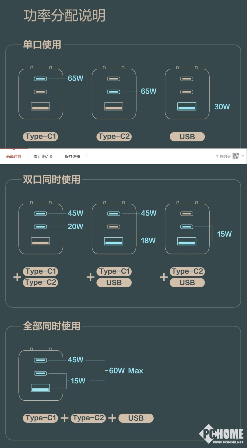 该产品使用单 Type-C 口进行充电时,两个接口均支持最大 65W 输出。功率分配说明如下: