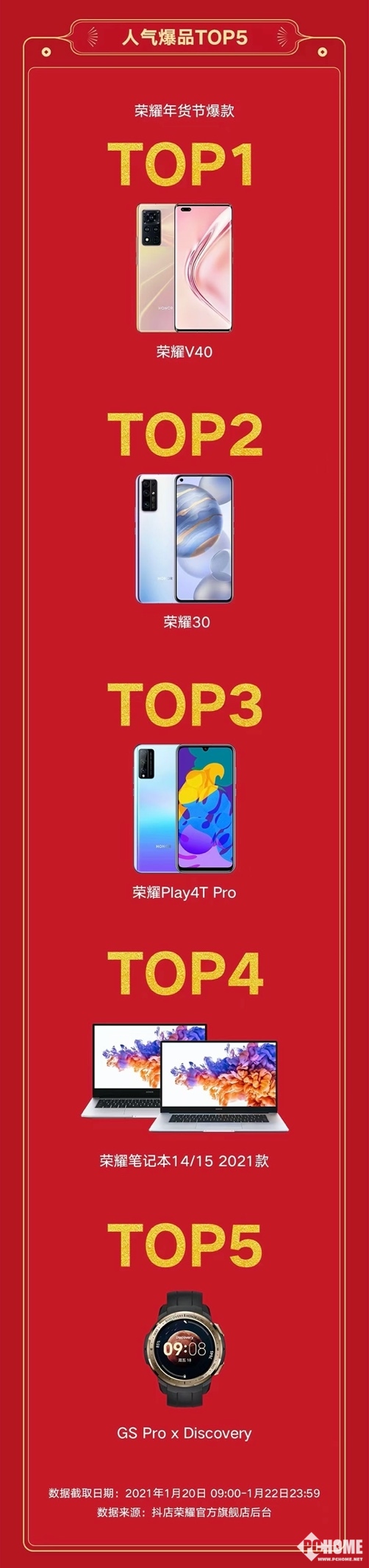 截止到1月22日24点,最受欢迎的明星爆款依次是,荣耀V40系列、荣耀30系列、荣耀Play4T Pro、荣耀笔记本14/15 2021款,荣耀手表GS Pro Discovery等。刚刚上市的荣耀V40系列人气超级火爆,首销仅3分46秒线上四大平台全部售罄,抖音直播首秀上架立刻秒抢空,消费者绝对是真爱了。