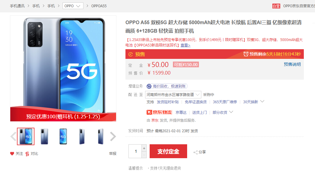 就在今天,OPPO A55在京东商城已经正式开启预购,根据页面显示,现在提供了轻快蓝、气质金、律动黑三种配色,目前该机型正在限时优惠,到手价为1499元。