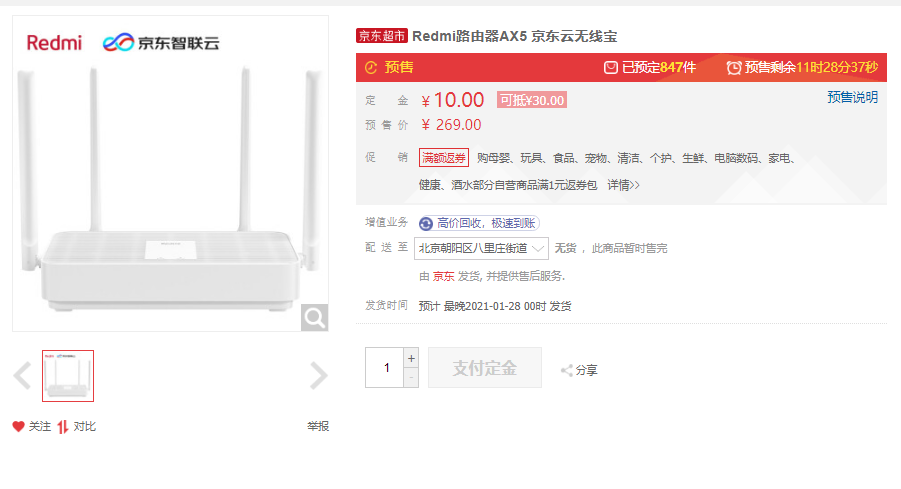 1月27号消息,Redmi此前上架的Redmi路由器AX5京东云无线宝将在明天正式开售了,售价269元,目前还可以在京东小米官方旗舰店进行预订。