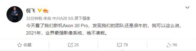 【PChome手机频道资讯报道】2021年新款的旗舰机型已经蓄势待发,在春节前的新机推出已经接近尾声了,准备在节后发布的新机目前也开始进行预热。中兴通讯终端事业部总裁倪飞今天就表示:今天看了我们新机Axon 30 Pro,发现我们的团队还是很牛的,我可以这么说,2021年,业界最强影像系统,绝不凑数。