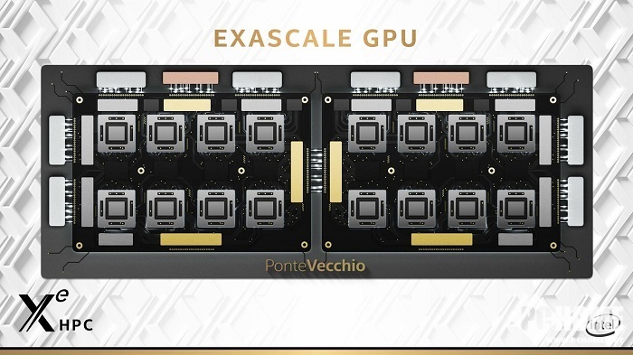 这款GPU芯片具有两个计算核心,采用英特尔7nm工艺制造,每个计算核心具备8个Die,以及高速缓存。核心周围总共具备8片HBM2高带宽显存,但容量未知。