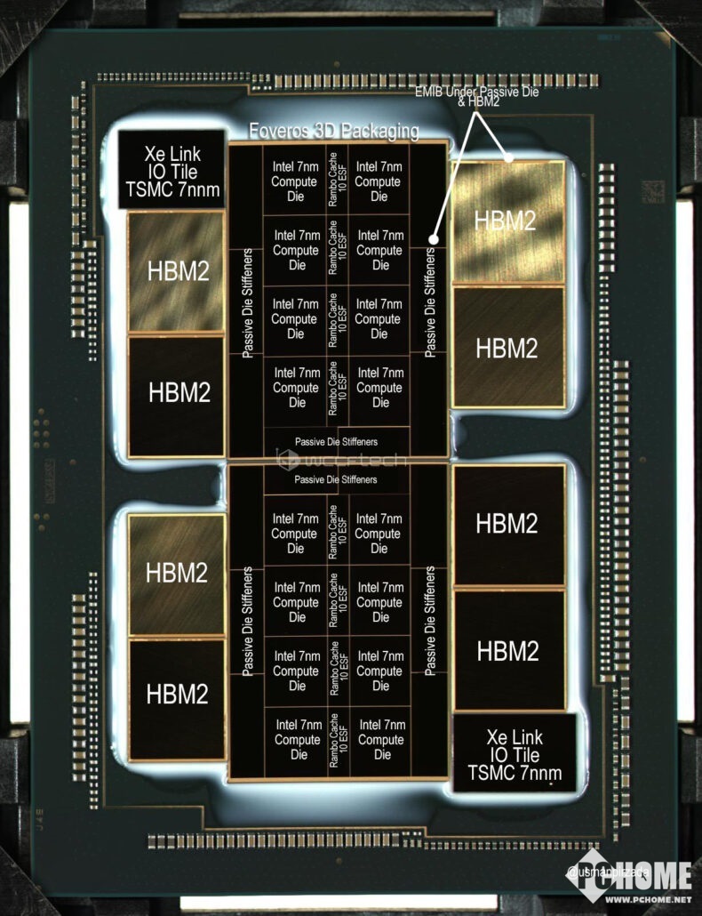 外媒 Wccfetch 对这个照片进行了分析并标注,从标注信息可以看出,这款 GPU 芯片具有两个计算核心,采用英特尔 7nm 工艺制造,每个计算核心具备 8 个 Die,以及高速缓存。核心周围总共具备 8 片 HBM2 高带宽显存,但容量未知。