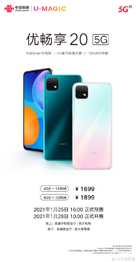 今日上午十点,优畅享20将率先开启首销,提供4/6GB+128GB两种版本,售价分别为1699元和1899元,可在联通手机营业厅及各大合作电商平台选购。