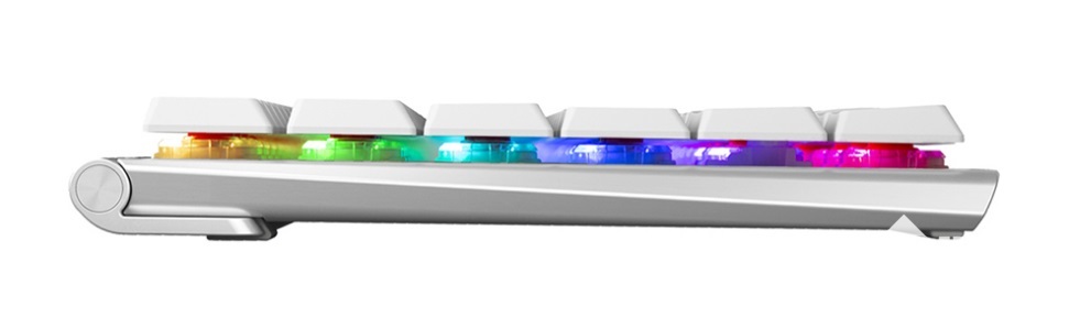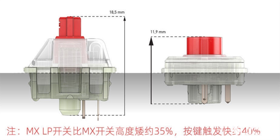 由于采用矮轴设计,键盘厚度仅为 22mm,这样便于用户不依赖腕托进行打字,提高舒适度。键盘采用 CNC 一体式铝外壳打造,进行阳极氧化处理,结合 RGB 灯光十分有质感。此款键盘搭载樱桃自家的 MX LP 红轴矮轴,高度仅为 11.9mm,采用镀金十字触点,按键触发快约 40%。该轴体为德国原厂制造,透明的外壳能很好地展现灯光效果。