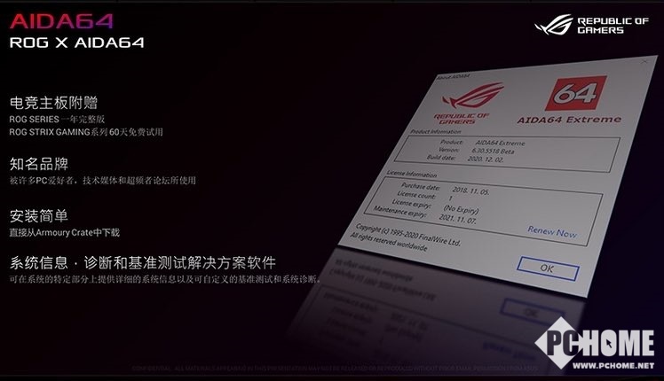 华硕还为ROG Z590、B560电竞主板提供60天的AIDA64 Extreme使用权。该工具用于全面检测电脑硬件信息,Extreme全功能版需要付费购买,售价39.95元。