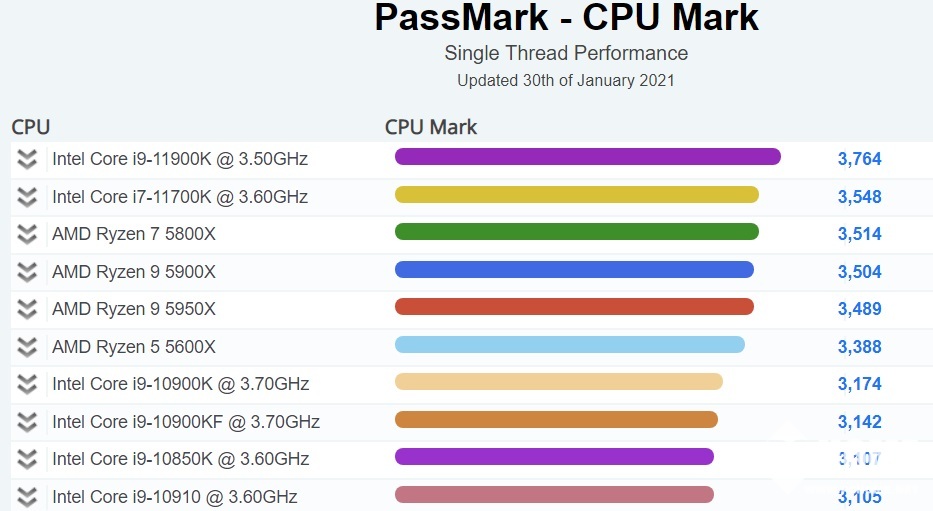 据外媒videocardz报道,英特尔的i9-11900K在PassMark上亮相。据PassMark的测试,i9-11900K的CPU Mark(单线程性能)得分为3764分,排名第一,比基于Zen3架构的锐龙7 5800X高出7%,而后者是排名最高的锐龙系CPU。