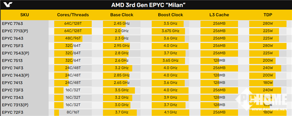 热设计功耗最低的是霄龙7313/7313P,仅为155W,但拥有16核心,主频为3.0-3.7GHz。