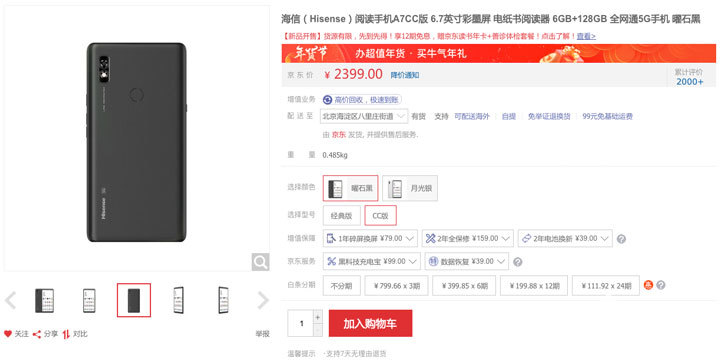 海信5G阅读手机A7 CC版也于2月1日在电商平台发售,6+128GB版本售2399元,支持12期免息分期,年货节活动期间还有更多福利等你来拿。