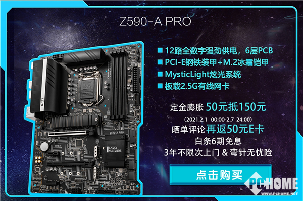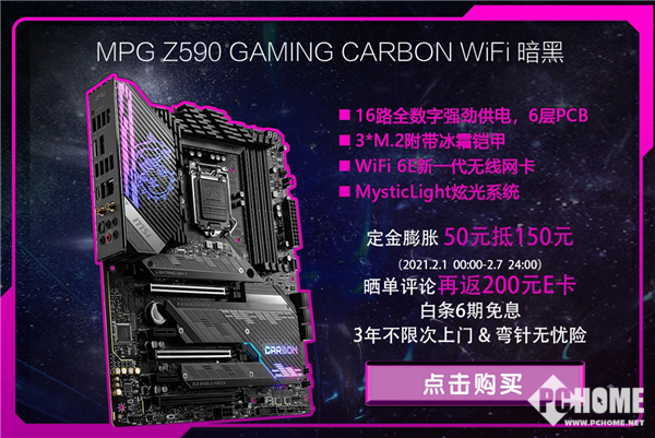 MPG Z590 GAMING CARBON WIFI暗黑预售价格2599元,Z590-A PRO预售价格1399元。,且均参与首发预售定金膨胀50元抵扣150元,等于分别在预售价格基础上再降价100元。