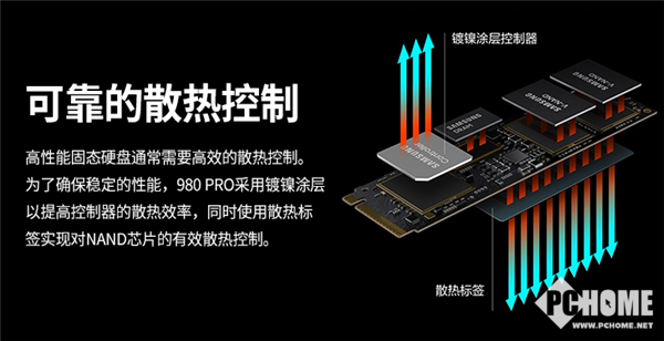 除了强大性能外,三星980 PRO还具有出色散热能力,三星在其控制器上涂覆了镍涂层,并在固态硬盘背面采用铜箔散热标签,同时配备动态散热保护技术,可有效散热减少性能波动。
