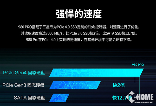 凭借搭载的三星专为PCIe4.0 SSD定制的Elpis控制器,据官方介绍,其连续读取速度比PCIe3.0 SSD提高两倍,相比SATA SSD则快了12.7倍。