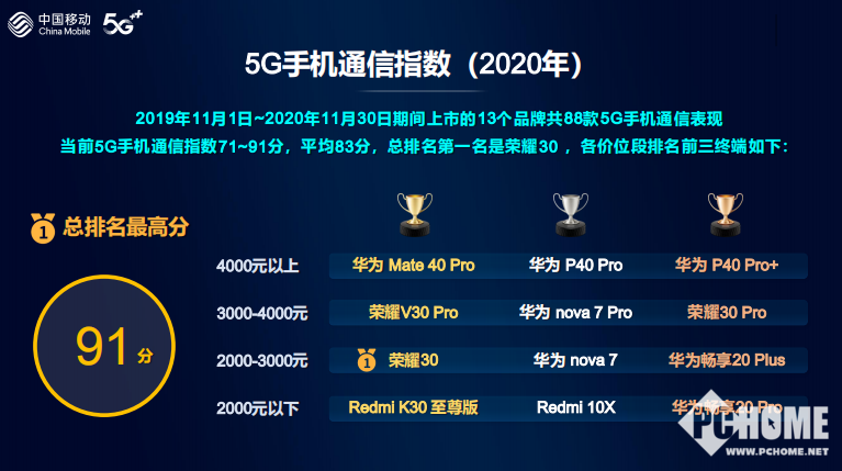 最终,中国移动针对13个品牌88款5G终端进行了综合排名。当前5G手机通信指数71-91分,平均83分,总排名第一名是荣耀30。可以看到的是,各价位段排名前三的终端几乎被华为、荣耀包揽,只有小米的两款机型杀出重围,具体5G机型用户可参考下方图片。