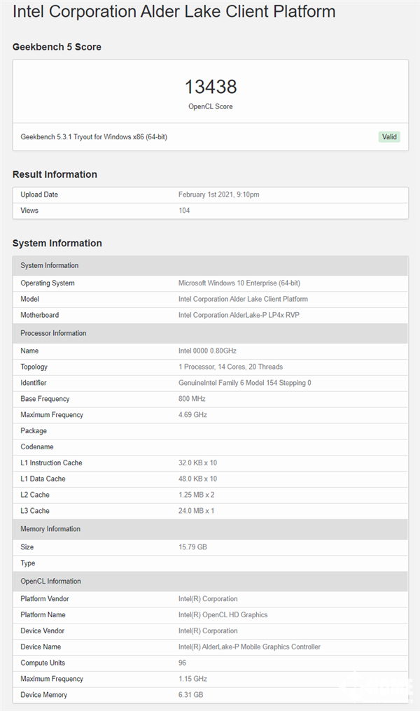 GeekBench 5数据库中出现了一颗Alder Lake,属于P系列桌面版,规格显示为14核心20线程,显然是6个大核心、8个小核心,因为只有大核心才支持超线程。