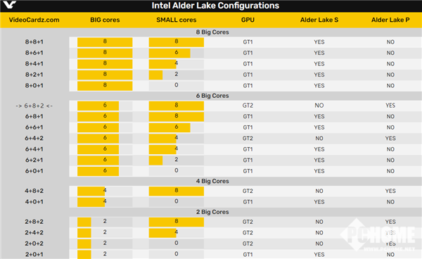 根据大核心、小核心、核显规模的各自规格不同,Alder Lake 12代酷睿将有极其复杂的配置阵容,看下表吧: