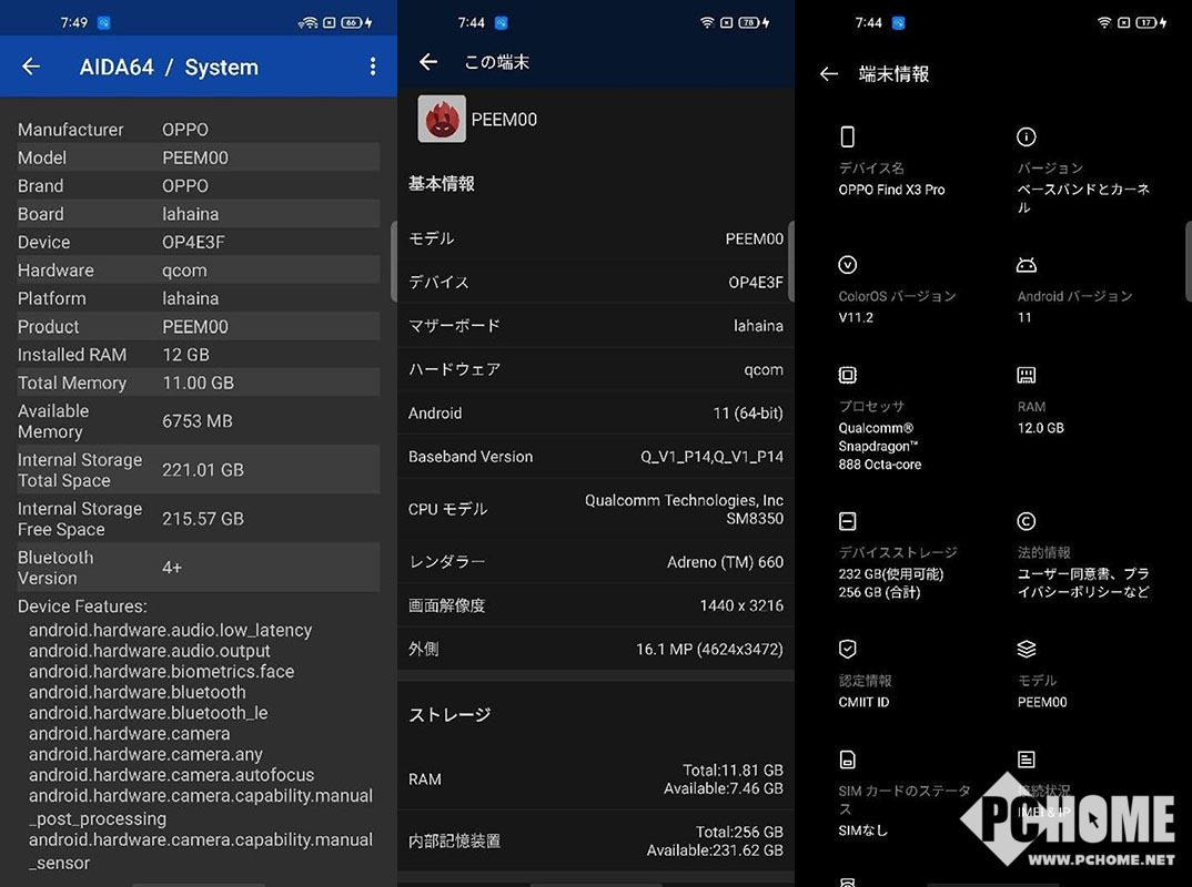 一款型号为OPPO PEEM00的手机出现在了安兔兔评测、AIDI64、GeekBench等平台之中,但它们仅仅揭示了一些硬件规格,并没有给出相应的测试成绩。该机可能就是OPPO Find X3 Pro。