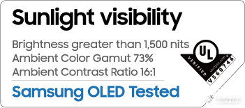 经过UL检测色域和亮度两个影响显示屏户外可见性的因素,结果发现,在户外环境下,三星全新OLED的色域满足DCI-P3标准的73%,且最大亮度超过1500尼特。