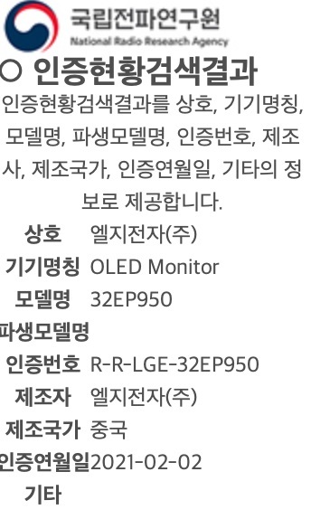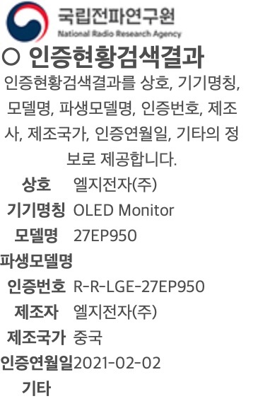 最新消息。 LG 的两款 OLED 屏显示器现已在韩国通过认证,显示屏的尺寸分别为 27 英寸和 32 英寸。从下方的图中可以看出,LG 两款显示器的型号分别为 27EP950 和 32EP950。目前,LG 还未公布产品的上市时间和售价信息。