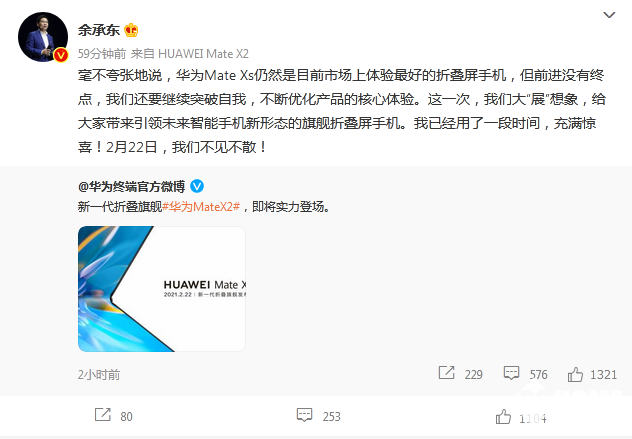 与此同时,华为余承东也表示,华为Mate Xs仍然是目前市场上体验最好的折叠屏手机,但前进没有终点,我们还要继续突破自我,不断优化产品的核心体验。这一次,我们大“展”想象,给大家带来引领未来智能手机新形态的旗舰折叠屏手机。