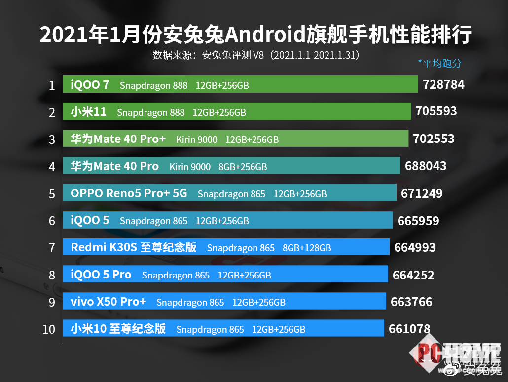 今天,安兔兔发布了“2021年1月Android手机性能榜”,榜单显示在旗舰手机性能排行中,排名第一的是iQOO 7,它以728784分的成绩占据榜首。