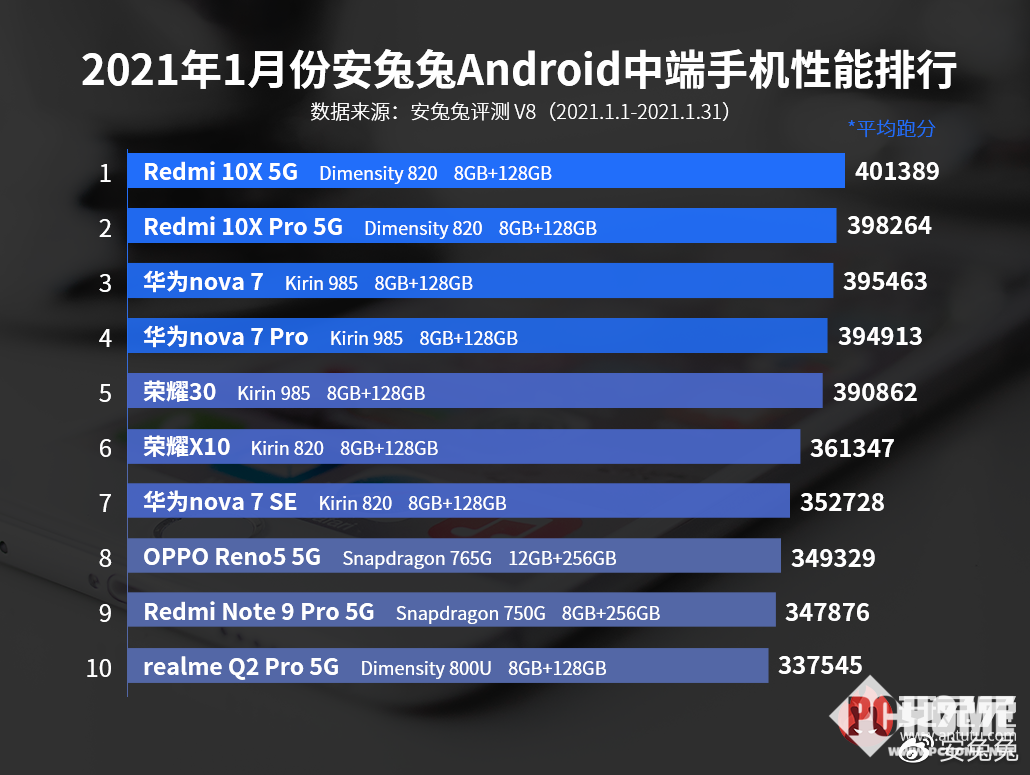 第二和第三名则分别被Redmi 10X Pro 5G、华为nova 7拿下,两者跑分分别为398246与395463。