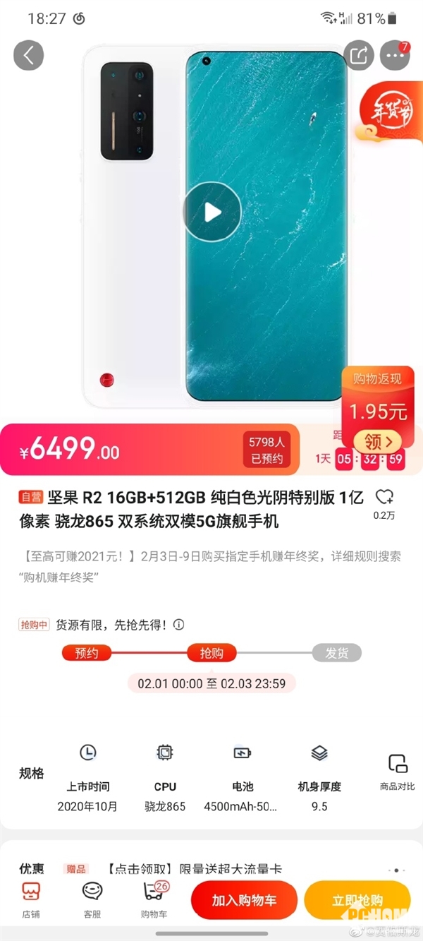 核心配置上,坚果R2采用6.67英寸OLED双曲面屏,搭载高通骁龙865处理器,后置一亿像素四摄(108MP+8MP长焦+13MP超广角+5MP微距),电池为4510mAh,支持55W。
