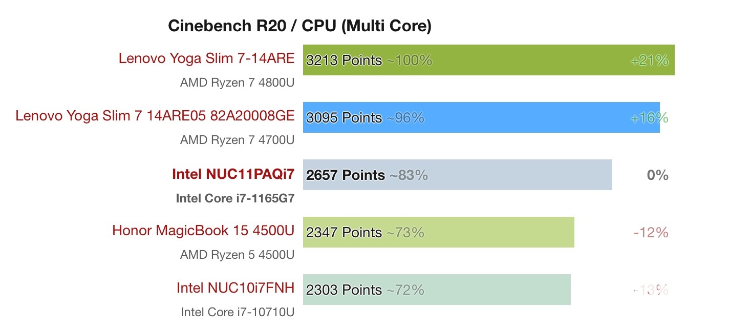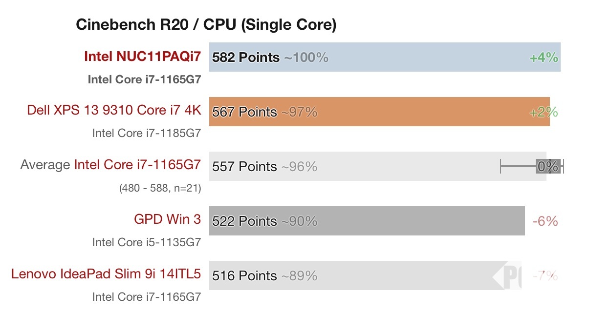 在 Cinebench R20 中,NUC 11 的 i7-1165G7 单核跑分很高,比平均分高出 4%,多核跑分也超过了上代的 6 核 i7-10710U 处理器。