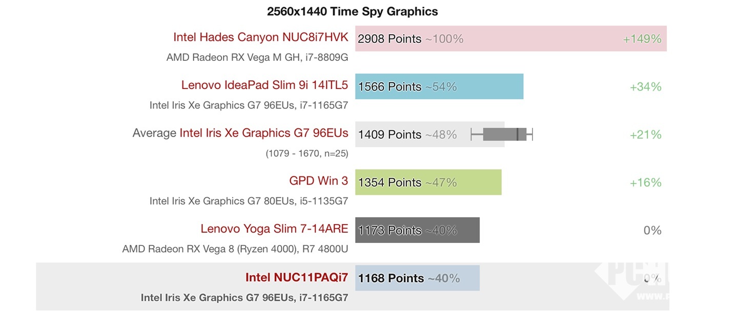 核显性能方面,用 DDR4-3200 内存的 NUC 11 核显跑分明显不如用LPDDR4X-4266内存的轻薄本。