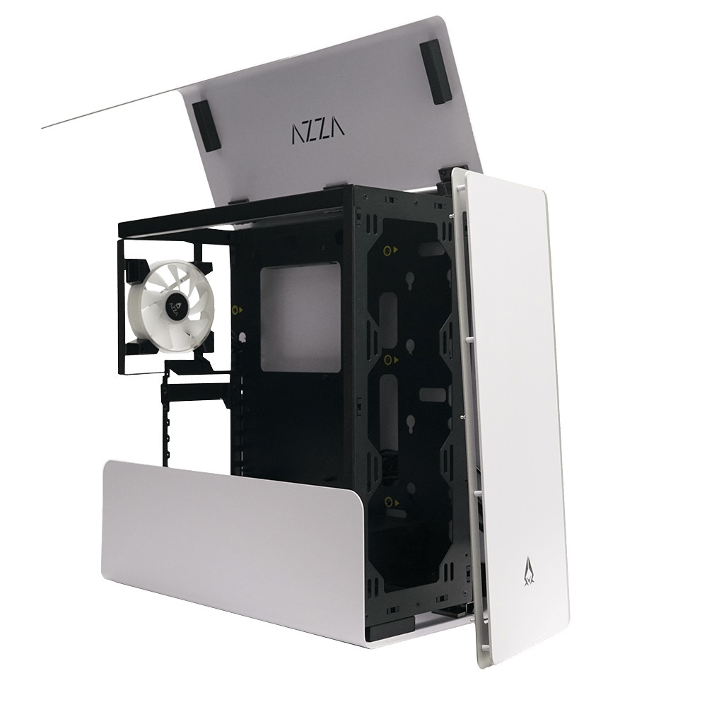 该产品前面板干净整洁,采用侧面进气设计,机箱前部有三个风扇位。机箱后部标配 AZZA Hurricane III 120 mm ARGB 风扇,采用纯白外观,半透明扇叶。同时,这款产品支持在前面板安装 360mm 规格水冷排。