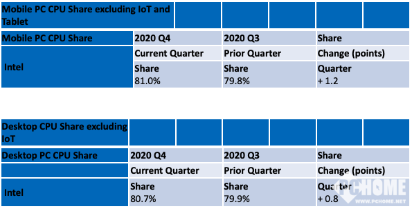 相比之下,Intel有自己的晶圆厂,这时候就显示出优势来了,处理器产能是有保障的,趁机扩大了市场份额。