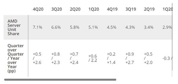 AMD的选择也获得了回报,在服务器市场的份额多年来首次突破了7%,达到7.1%,环比增加0.5个百分点,同比增加2.6个百分点。