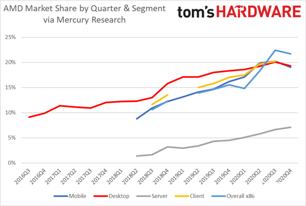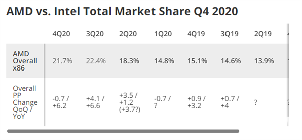 另外,在整个x86处理器市场上,AMD目前占据21.7个百分点,虽然环比跌了0.7个百分点,但是同比大涨了6.2个。