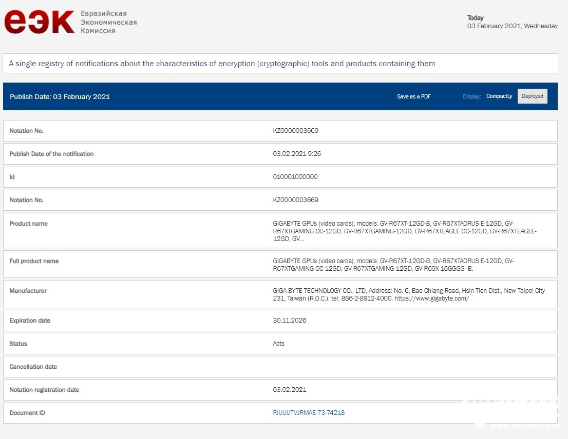 AMD RX 6700 XT是一款中端显卡,将于今年上半年发布。据外媒NotebookCheck消息,目前技嘉在EEC(欧亚经济委员会)注册了多款RX 6700 XT显卡。
