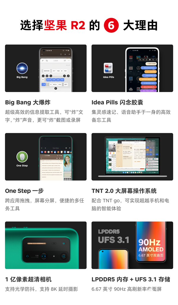 配置方面,坚果R2搭载骁龙865处理器,采用6.67英寸OLED双曲面屏,支持90Hz刷新率。