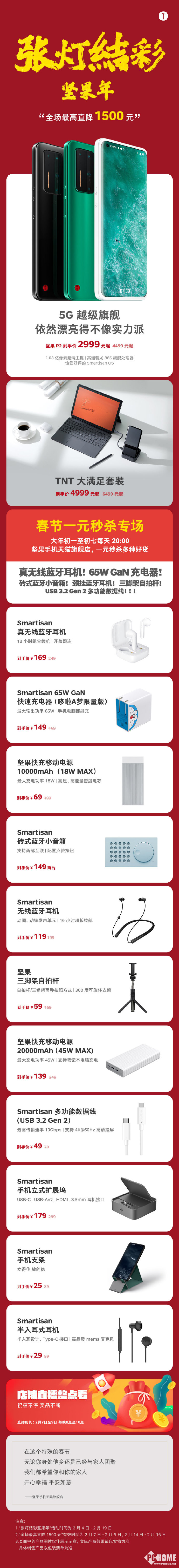 不仅如此,在此次坚果新春活动中,还有坚果快充移动电源、Smartisan真无线蓝牙耳机等多款数码配件参与春节一元秒杀专场。