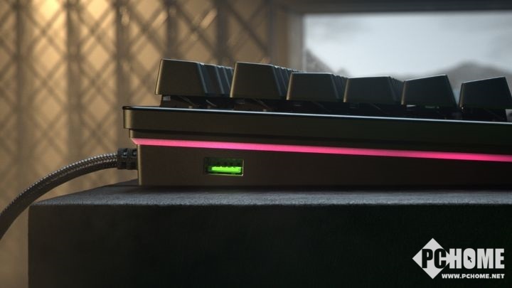 连接方面,键盘使用 USB 3.0 有线设计,侧面包含 USB 3.0 A 型接口。键盘板载 ROM 存储,可储存 5 组设置,回报率 1000Hz。