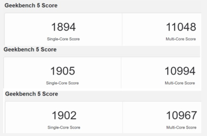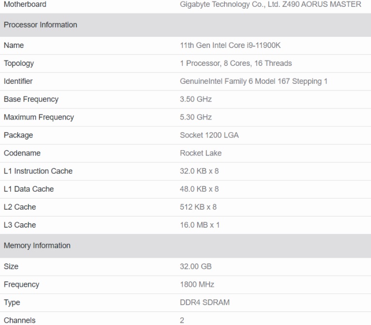 在之前的Geekbench数据库中,没有桌面级CPU的单核成绩超过1900分,但是最近有国外玩家突破了这个记录,达到了1905分。这位玩家使用的配置是这样的:Intel Core i9-11900K处理器、技嘉Z490 Aorus Master主板和32GB DDDR-4 3600内存。测试频率在5.2GHz,偶尔会下降到5.0—5.19GHz。